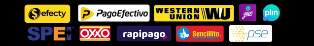 México (Oxxo) Chile (Sencillito) Perú (PagoEfectivo, YAPE, PLIN, Todos los bancos) y Colombia (Efecty). Otros Países (WESTER UNION)